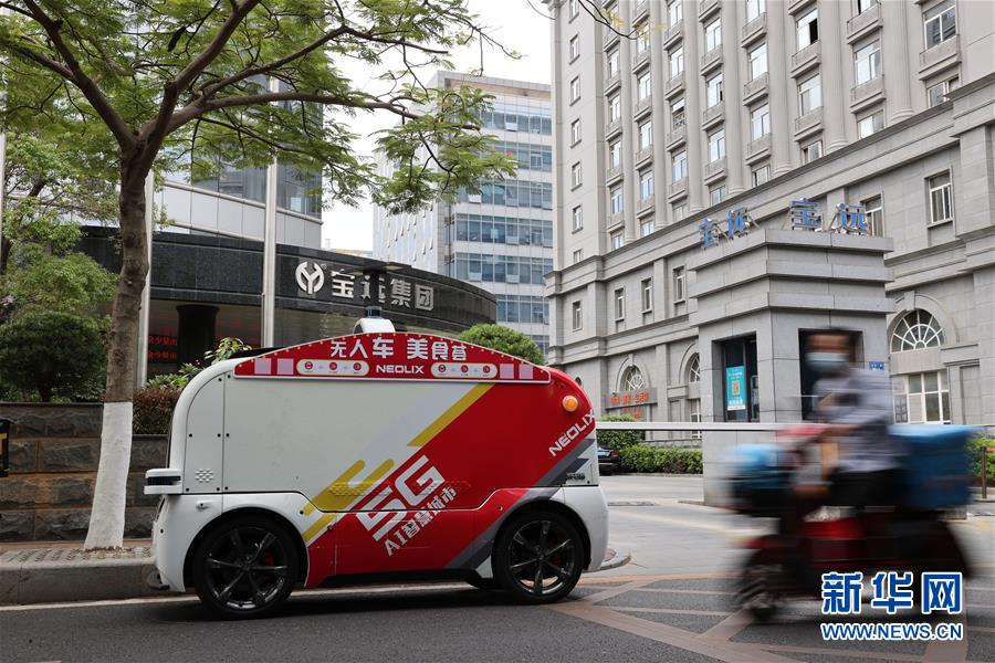 这是11月6日在厦门湖里创新园拍摄的无人驾驶餐车。 近日,4辆无人驾驶餐车在福建省厦门市湖里创新园投入使用。穿梭在创新园的无人驾驶餐车可装载200余份早餐或100余份午餐、晚餐。餐车设有保温装置,通过手机扫码完成支付,人们就可领到选购的餐食。 新华社发(曾德猛 摄)