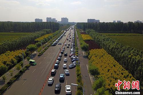 资料图:安新县崇文大街两侧停满前来旅游的车辆。中新社记者 韩冰 摄