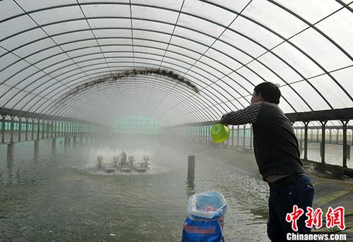 3月9日,走进位于雄安新区的雄县创新农业科技示范园,一排排大棚内的绿植和热带鱼交相呼应,整个园区一派生机盎然。图为工作人员喂养热带鱼。中新社记者 韩冰 摄