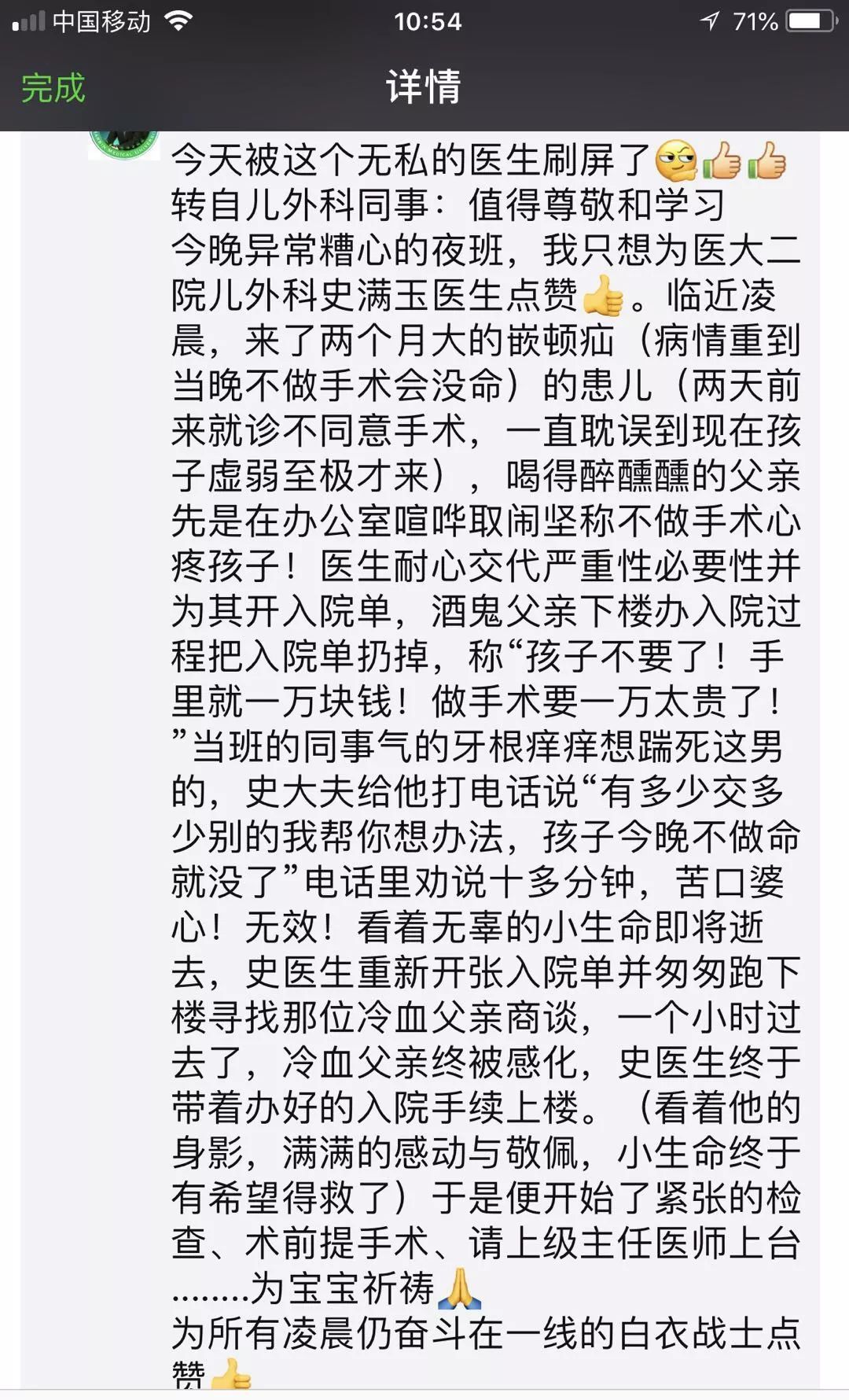 14日,很多市民的微信朋友圈被哈医大二院儿外科的史满玉医生刷屏了!一名2个月大的男婴患上了坎顿疝,如果不及时手术将有生命危险,可是糊涂的父亲心疼孩子太小,不想做手术,竟然拒绝了医生的建议,医生苦口婆心劝了这名父亲两个多小时,终于把他打动,让孩子及时接受了手术治疗,一条小生命也因此得以挽救。