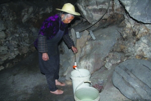 山洞里有许多小耳洞,最高的一个地方常年出水,崖壁上挂满了钟乳石。老人的子女们帮她在耳洞中修了一个蓄水池,可以蓄水约2个立方米,并将10余米长的水管引到“客厅”,要用水时,老人只要拧开龙头,水就来了,十分方便。