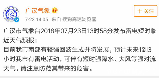 成都商报记者查询“广汉气象”官方微博发现,7月23日下午2点05分,“广汉气象”发布2018年7月23日13时58分的雷电短时临近天气预报:“目前我市南部有较强回波生成并将发展,预计未来1到3小时我市有雷电活动,可伴有短时强降水、大风等强对流天气,请注意防范其带来的危害。”