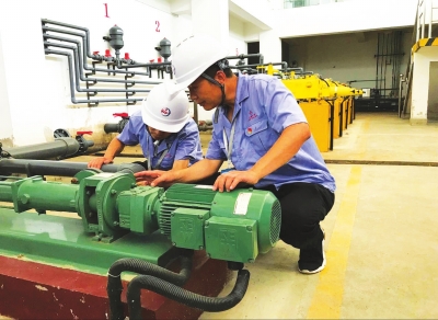 采访过程中,刚好碰到制水一厂副厂长谢江峡和工艺技术员王力哲进行巡检。经过钢制扶梯他俩来到地下二层的设备间,蹲下来检查阀门,谢江峡不时擦拭着额头上的汗水,王力哲早已汗流浃背,工作服的后背湿了一大片。