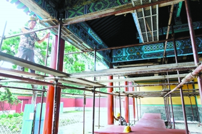昨天,施工人员对景山公园观德殿建筑群第一、二进院进行全面的修缮施工。本报记者 吴镝摄
