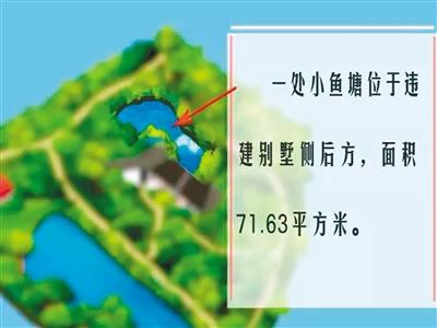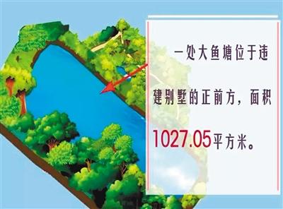 陈路超大违建别墅院内共有鱼塘两处,占地面积共计1098.68平方米,深约两米。其中别墅北部大鱼塘面积1027.05平方米,别墅南部小鱼塘面积71.63平方米。
