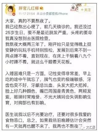 我长期熬夜到1点多才睡,第二天又早早起来工作。周末的时候一觉睡到12点多才起床,只吃两顿饭,晚上2、3点多才睡觉。熬夜的伤害其实长期潜伏在你的身体里,你永远都不知道什么时候会爆发。