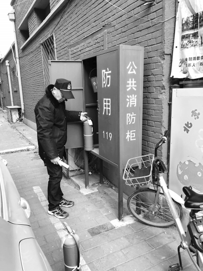 ▶朝阳区八里庄东里,一工作人员在检查公共消防柜。