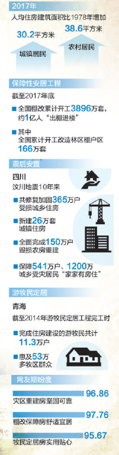 习近平总书记在庆祝改革开放40周年大会上指出,“40年来,我们始终坚持在发展中保障和改善民生”“建成了包括养老、医疗、低保、住房在内的世界最大的社会保障体系”。“住有所居,安居宜居”是万千家庭的共同心愿。从1亿人“出棚进楼”,到灾后重建安置房,再到农村危房改造和游牧民定居,我国保障性安居工程稳步推进。