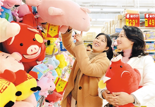 12月26日,江西省分宜县沃尔玛超市,顾客在选购吉祥物。明年是农历猪年,以生肖猪为主题的毛绒玩具、饰品等商品备受顾客青睐。