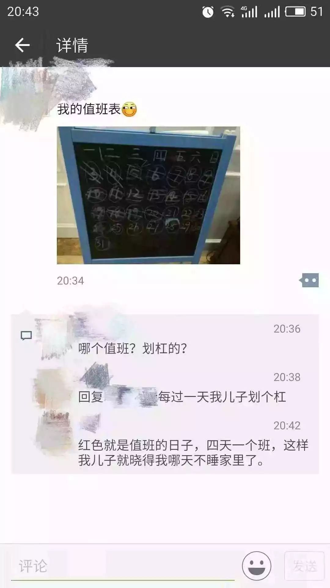上面朋友圈是沈伟发布的,从留言中,我们揭开了勋勋手绘日历中暗藏的“玄机”,原来,红色代表爸爸要值班,蓝色则代表爸爸可以陪自己。