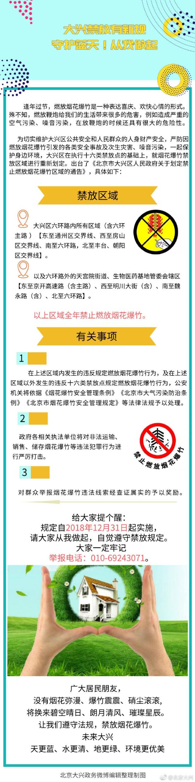 北京大兴区官方微博消息,为切实维护大兴区公共安全和人民群众的人身财产安全,大兴区在执行十六类禁放点的基础上,就烟花爆竹禁放区域进行重新划定。出台了《北京市大兴区人民政府关于划定禁止燃放烟花爆竹区域的通告》,具体如下: