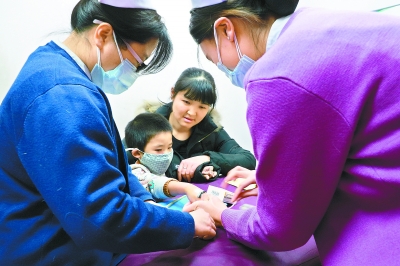 在北京友谊医院儿科治疗室,护士正在为生病的患儿输液,家长在一旁鼓励孩子要勇敢。