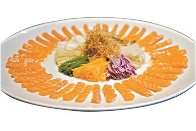 最先登场的是“风生水起”,这是一道传统意头菜。在珠三角一带,过年时人们必定要来一份“风生水起”,即“捞鱼生”。在新加坡和马来西亚,不少华人家庭至今仍保持这个饮食习俗。他们将鱼生切片、摆好,荞头、柠檬叶、蒜片、芋头丝等材料摆放在一边,众人举筷夹起鱼生和配料,一起喊:“捞起!”传统“捞起”大多采用顺德鱼生,吴玉擎师傅选用挪威三文鱼,它粉嫩如玉脂,口感更出彩。搭配荞头、柠檬叶、蒜片、仔姜、红萝卜、芋丝、野生椒皮,食客品尝前先给三文鱼淋上花生油,再撒上盐、芝麻,一齐捞起。