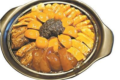 在粤菜团年饭中,每一道菜式都寓意美好的祝愿。“盆满钵满”称得上是团年饭中的一号主角。那一大煲盆菜包含大连鲜鲍、海参、大明虾、深海鱼胶、鹅掌、阳山大扇鸡,以鲍汁焖扣,滋味无穷。松露秘制加拿大龙虾烹调“群龙齐贺”菜式,那是从传统的“龙虾伊面”菜式升级而来,黑松露酱与芝士碰撞,带来新鲜的滋味。“年年有余”即清蒸珍珠龙趸斑,“金鸡报喜”是御品贵妃鸡。贵妃鸡选用生长日期达到180天的文昌鸡,鸡味浓郁。“大展宏图”为古法香扣赛虎掌,是从传统粤菜“发财就手”演变而来的。主角是猪手,吴师傅用料求精,只选用土猪的后腿猪肘中间带筋的一段,此处口感最佳。采用古法“瓦鐣扣”的烹调方式,加入蚝油、生抽、黑胡椒、八角等“慢扣”一个多小时,再熄火焗至猪手松软入味。猪手入口令人惊艳,只因加入新加坡黑胡椒调味,大厨在“慢扣”后再去掉猪手里面的骨头,食客尝起来啖啖肉。