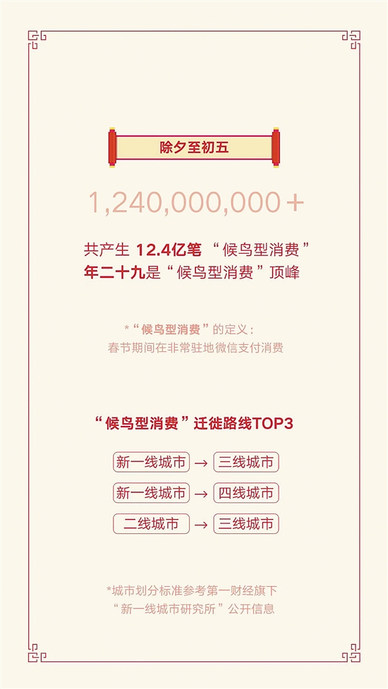 在境内,“候鸟型消费”明显增长。“候鸟型消费”指在非常驻地的微信支付消费。微信数据显示,春节期间,全国范围内共产生了12.4亿笔“候鸟型消费”。从迁徙路径来看,由新一线城市向三线、四线城市迁移的微信支付消费笔数最多。四五六线城市“候鸟人口”微信支付交易笔数占比均超过40%。
