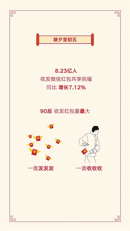 除夕到初五期间,微信消息发送量较去年同期增长64.2%,8.23亿人次收发微信红包,同比增长7.12%。除夕当天,单日消息和朋友圈信息量达到顶峰。其中,“90后”实现了发出最多条微信消息、最多条朋友圈、最多个表情包,以及收发最多次微信红包的“四个最”。