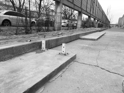 居民带着记者来到小区北门,在北门内东西两侧的地面上,各有两个几厘米高的水泥台阶,台阶宽四五十厘米、长三四米,其中一个台阶边缘还立着两根十几厘米高的金属杆。“水泥台上以前立着四个快递柜,居民进出门就可以从柜里取快件,拆完后大家以为这里要建什么东西,都过去两三个月了也没动静。”
