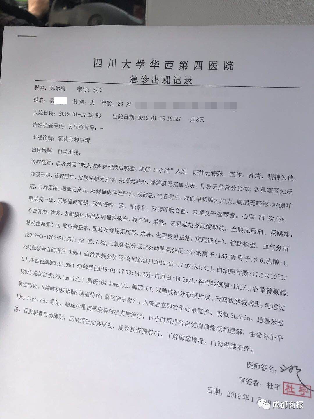 “输了几天液,又做雾化、吸氧。”19日,他的出院诊断上写着:“氟化合物中毒。”