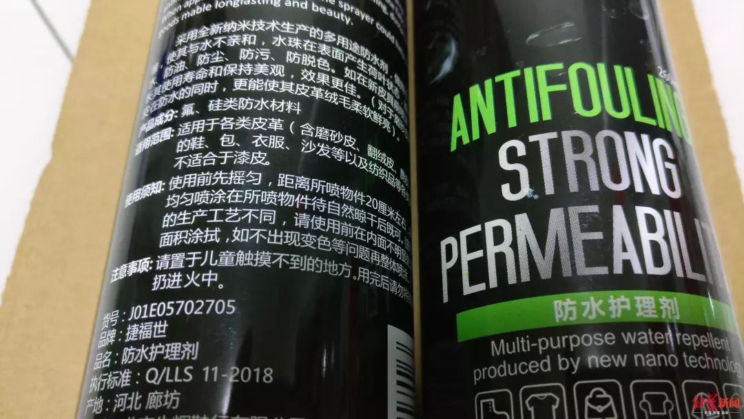 记者查看了这款“防水护理剂”的罐体,产品成分一栏写的是“氟、硅类防水材料”,使用须知中提到“距离所喷物件20厘米”,并无类似“在通风处使用”的提示,产品执行标准系企业标准,生产商为北京生辉鞋行有限公司。公司网站上显示,其代理和经营多款皮具清洗护理以及鞋的防水护理喷剂、鞋油等产品。
