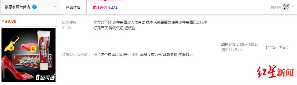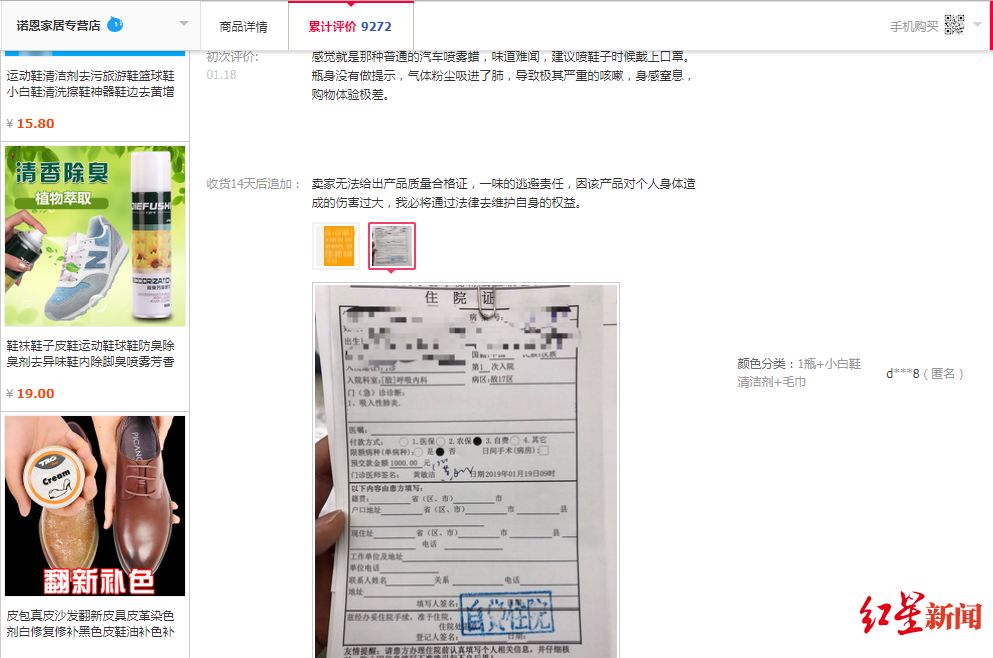 今年1月18日一位用户在评价时表示:“味道难闻……吸进了肺,导致极其严重的咳嗽,感觉窒息”。14天后他追加了评论,晒出了一份打了马赛克的住院证明。并讲述了过程:“使用该产品喷洒鞋子,发生呼吸困难并剧烈咳嗽,随即进医院急诊挂点滴及吸氧未见好转,门诊诊断为吸入性肺炎,白细胞剧增,血氧含量低,目前已办理住院。”