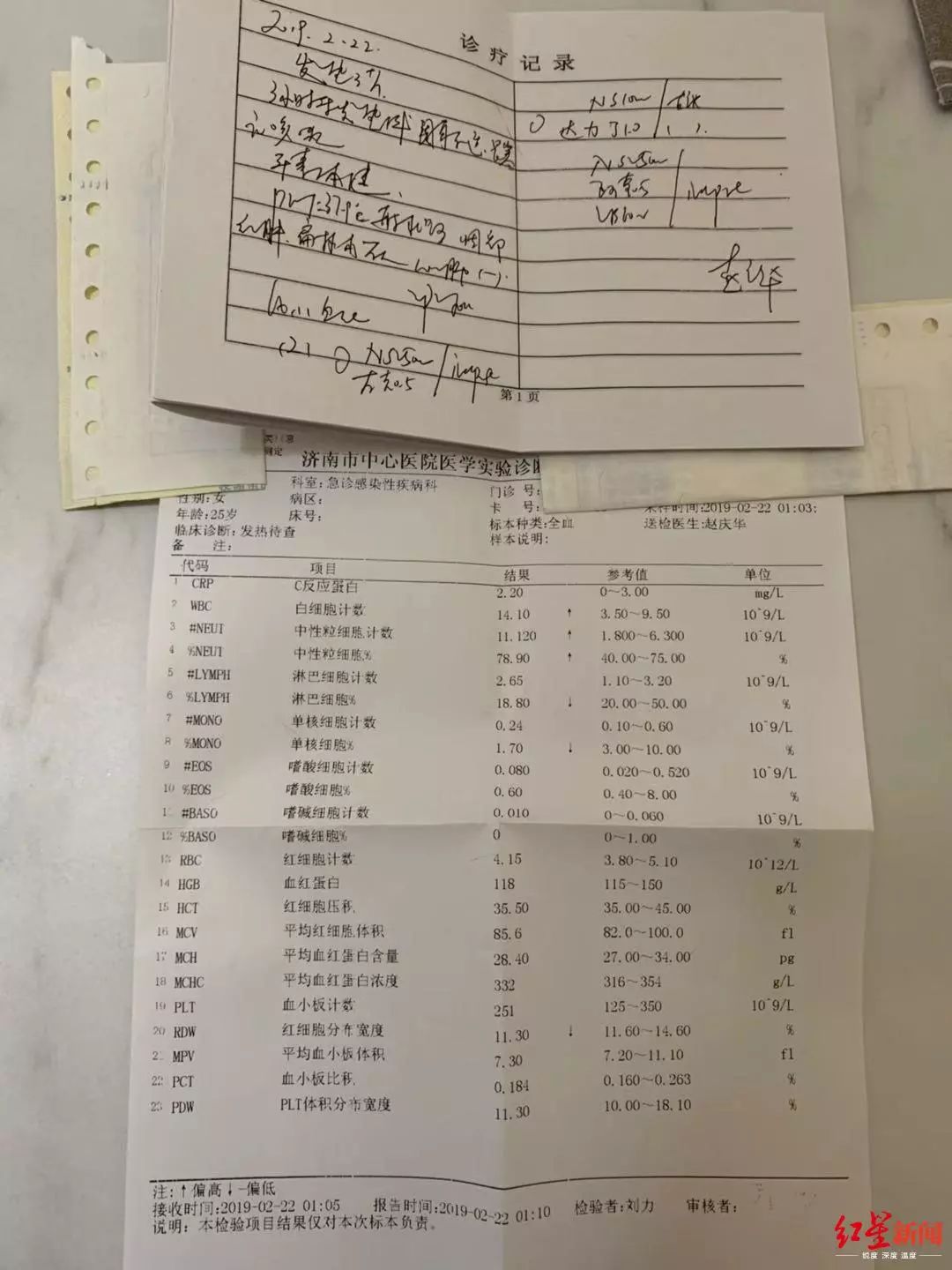 她展示的一份检查结果显示,其白细胞数、中性粒细胞数显著上升。“输液到凌晨三点。”第二天起床时,“一呼吸就感觉肺疼,只能轻点、急促呼吸。”她表示,自己又吃了三天的消炎药,“25号晚上以后才稍微好点。”