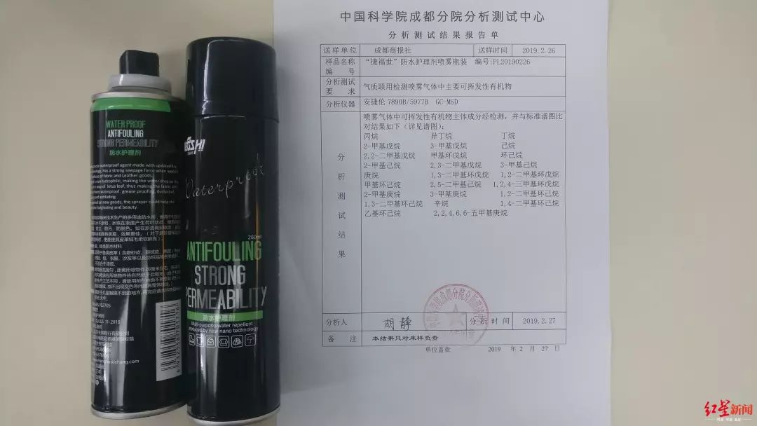 记者将捷福世防水护理剂拿去检测的检测报告