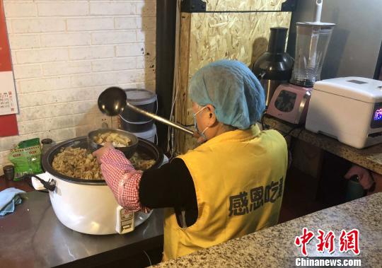 图为餐厅义工正在打饭。 高铖 摄