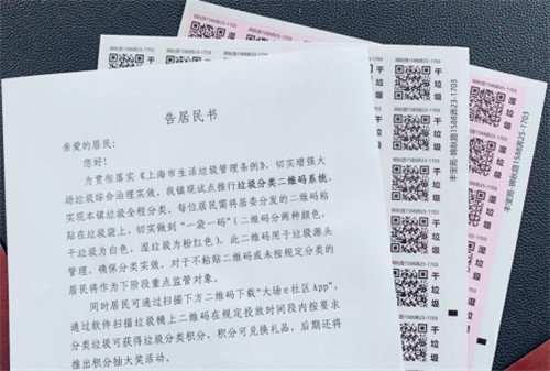 上海市宝山区大场镇的李阿姨(化名)每天坚持将垃圾分类之后,再投放在相应的垃圾箱内,在小区志愿者的引导下,李阿姨将小区分发给每家每户的二维码贴在自家的垃圾袋上,再扫垃圾箱上的二维码将垃圾投入垃圾箱里,志愿者再协助小区物业将分类好的垃圾再次检查投递给环卫,这是第一道检查,环卫运输时城管会不定时抽验分类运输情况,不合格的垃圾可进行罚款,问题垃圾也会退还给物业,倒逼物业公司加强管理,通过倒逼闭环机制促使物业管理垃圾分类。