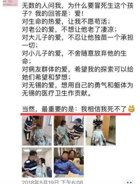 “无数的人问我,为什么要冒死生这个孩子?我的回答是,爱!对于生命的热爱,让我不愿苟活;对老公的爱,不想让他老了凄凉;对大儿子的爱,不忍让他独苗一个承担一切;对小儿子的爱,不忍随意放弃他的生命 … … ”2018 年 5 月 19 日,吴梦在朋友圈发出这段话。 11个月后,她的朋友们也是从朋友圈知悉她的离去。4 月 1 日晚上8点46分,丈夫王先生在朋友圈发出讣告。