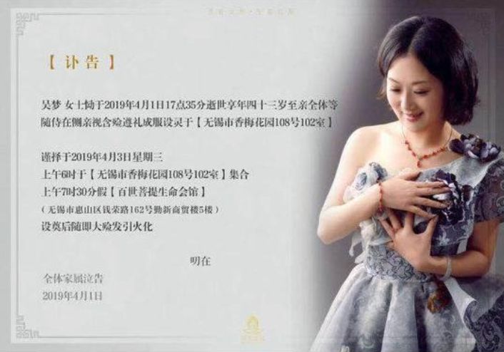 2018年12月,吴梦因感染住院。2019年4月1日,吴梦在无锡病逝,年仅43岁。