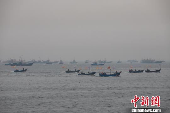 广场中间,渔民们把酒祭酹、祝告沧海:愿风平浪静,鱼翔虾跃,生生不息……伴随着出海号令的响起,停泊在渔港内的100艘渔船扬帆出海。