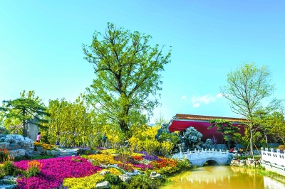 池塘、假山的映衬下,北京园呈现出和合如意、青瓦盛芳、棠花童真、玉堂长春、甘雨荷风、百花深处、碧峰花影、什锦花坊等“北京园八景”。