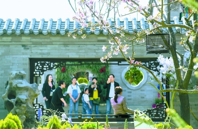 在海棠、连翘等北京人熟悉的花卉衬托下,滚铁环、跳房子等“京味儿”童年生活场景唤起了人们对老北京的文化记忆。“棠花童真”一景借用园林“框景”手法,以漏窗呈现出一座烂漫的童真花园,成为大家争相拍照留念的“打卡”景点。“90后”小娄被眼前特有的京味儿所吸引,举起相机拍个不停。她还特意下载了一款APP,手机一拍照就能识别出花的名字和品种。