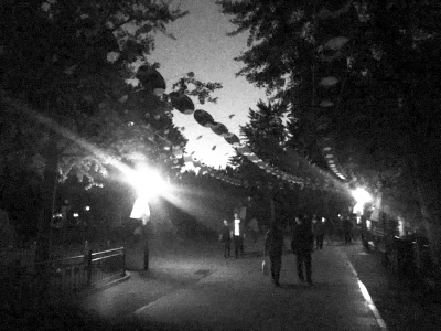陶然亭公园的甬路上,散步的人不少,但是灯光有些昏暗。