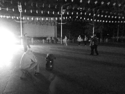 另一处小广场上,一个个光点忽地飞上天,再缓缓落下。原来是一位小贩正在出售小玩具,弹射的螺旋桨带着一个小灯珠飞到天上再落下来。这里是孩子们的乐园,5块钱买个玩具,飞上天再接住,欢笑声不断。在一旁的家长孙先生,始终不敢离开孩子超过两米远。“您看这个小广场,里面有十多个孩子,却一盏灯都没有。孩子盯着空中的亮光追着跑,一不小心就会互相撞在一起。”