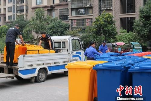 工作人员正在辖区设置垃圾分类收集点。中新社记者 韩苏原 摄