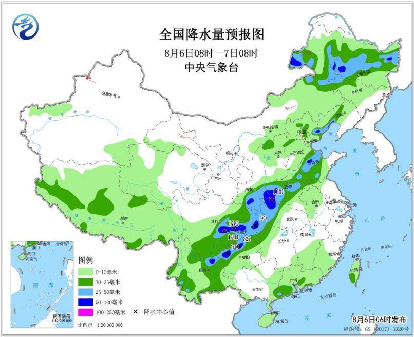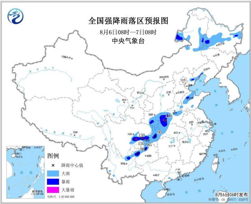 预计,8月6日8时至7日8时,内蒙古东部、黑龙江中南部、辽宁西南部、河北东北部、山东中部、河南西部、陕西南部、湖北西部、四川东部、重庆大部、贵州北部、云南东北部等地的部分地区有大到暴雨,局地大暴雨(100~130毫米)。上述部分地区伴有短时强降水(最大小时降雨量20~50毫米,局地可达60毫米以上),局地有雷暴大风等强对流天气。中央气象台8月6日06时继续发布暴雨蓝色预报(见图1)。