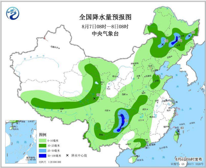 8月7日8时至8日8时,内蒙古东部、东北地区中部、山东中西部、西南地区东部、江汉西部、云南东北部、甘肃西部、青海东部、西藏中部、台湾岛东北部等地部分地区有中到大雨,其中,黑龙江中南部、吉林中北部、重庆南部、贵州中部等地部分地区有暴雨(50~70毫米)。新疆沿天山地区部分地区有4~5级及以上风(见图3)。东海南部海域、台湾以东洋面、巴士海峡将有7~9级的大风。