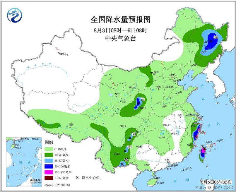 图4 全国降水量预报图(8月8日8时-9日8时)