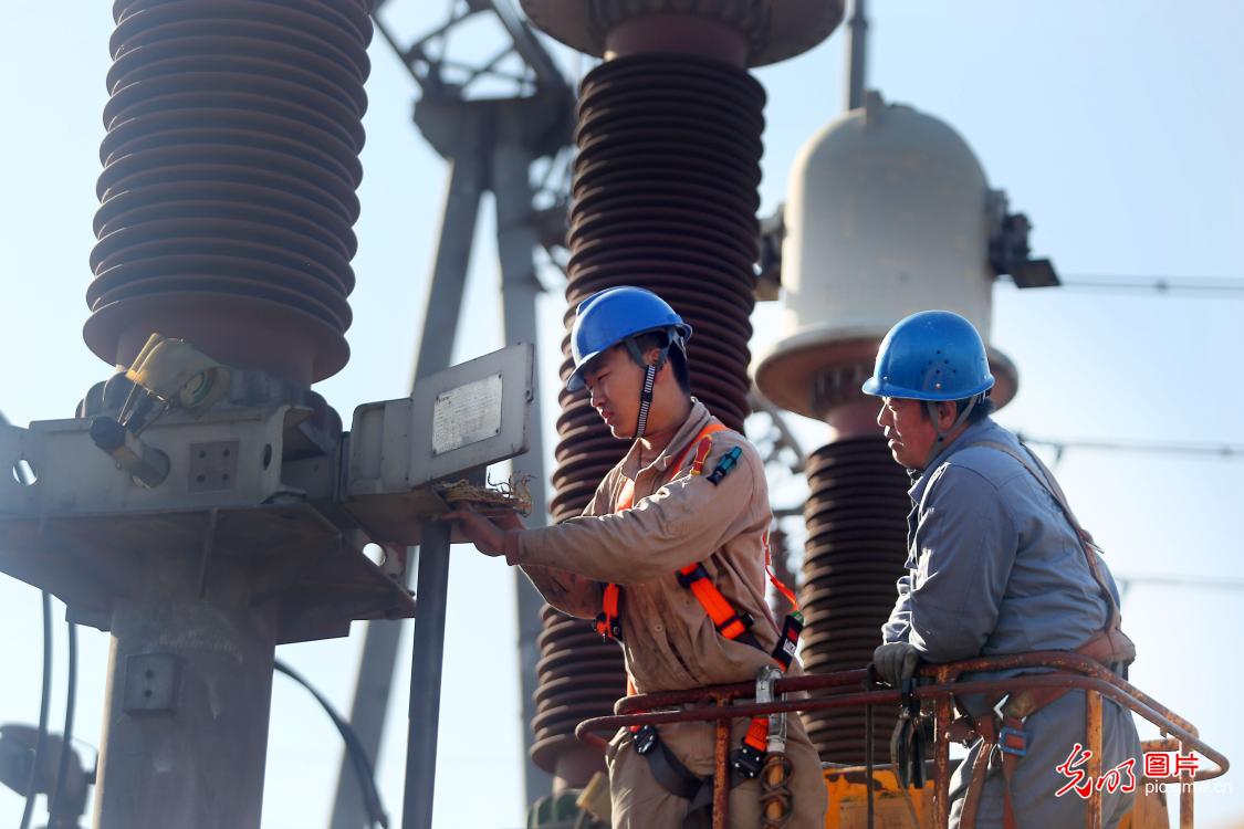 2020年11月3日,国家电网天津检修公司作业人员在仁和营220千伏变电站进行4号主变高压侧电流互感器更换工作,保障冬季供暖期间用户可靠用电。(刘东岳摄/光明图片)