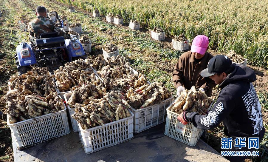 11月3日,在河北省赵县韩村镇,赵县天舟农作物种植专业合作社的农民将生姜装车运输。 近日,河北省石家庄市赵县韩村镇种植的生姜进入成熟收获期,当地村民在田地里起姜、拾筐、装车,一派繁忙景象。 近年来,河北省赵县结合市场需求,引导农民种植生姜近2000亩,拓宽农民的致富渠道。 新华社发(梁子栋 摄)