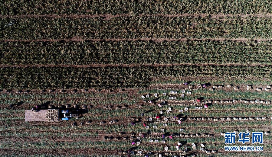 11月3日,河北省赵县天舟农作物种植专业合作社的农民在田间收获生姜(无人机照片)。 近日,河北省石家庄市赵县韩村镇种植的生姜进入成熟收获期,当地村民在田地里起姜、拾筐、装车,一派繁忙景象。 近年来,河北省赵县结合市场需求,引导农民种植生姜近2000亩,拓宽农民的致富渠道。 新华社发(梁子栋 摄)
