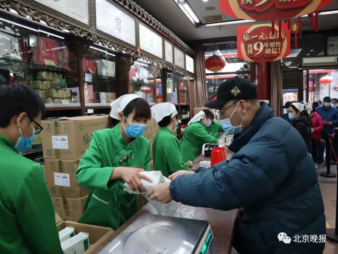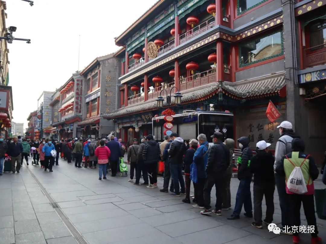 今天早晨8时,在前门大栅栏商业街,购买高碎的队伍缓缓移动,从店门口排到了商业街路口,场面一如往年火爆。