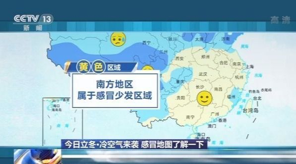 而图上的黄色区域,也就是图上标注笑脸的区域,主要是南方地区,属于感冒少发区域,但是也要提醒大家,虽然属于感冒少发区域,但不可大意。因为立冬节气后,冷空气实力还是比较强,有时会一路南下影响到江南,甚至华南一带。