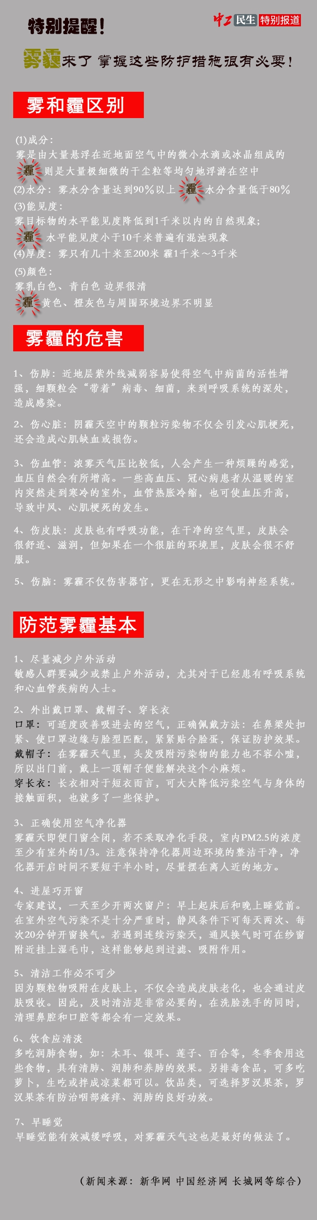 特别提醒!雾霾来袭,敏感人群要减少或禁止户外活动。必要时,外出戴口罩,饮食应清淡。