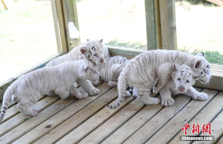 5月20日,雪虎五胞胎嬉戏玩耍。当日,以中国“五岳”名山命名的雪虎五胞胎在济南野生动物世界与游客见面,“雪泰”、“雪衡”、“雪华”、“雪恒”、“雪嵩”5只小雪虎模样呆萌,十分可爱。 中新社记者 张勇 摄