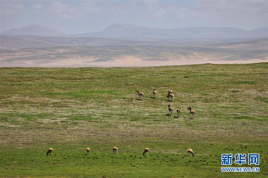 可可西里的藏野驴和藏羚羊(7月15日摄)。新华社记者 田文杰 摄