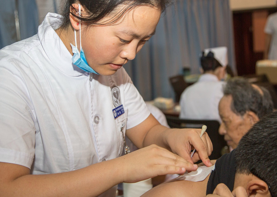 夏日炎炎,市民们对三伏贴的热情不减。作为中医特色疗法之一,“冬病夏治”三伏贴一直深受广大群众喜爱。今年的三伏天从7月17日开始,至8月25日结束,为期40天。从昨日起,一年一度的三伏贴在北京市各大社区卫生服务机构和部分医院正式开贴。图为北京中医药大学东方医院三伏贴贴敷现场(摄影/闫剑坤)
