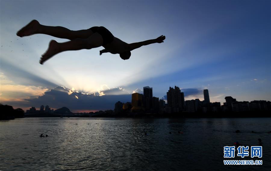 7月18日,在广西柳州市柳江赵家井水域,市民在江面上跳水。 新华社发(黎寒池 摄)