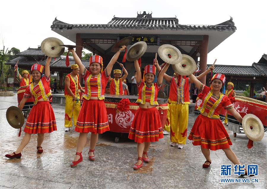 7月19日,在广西南宁市青秀区南阳镇施厚村古岳坡,几名女子在南阳大鼓展演中敲打乐器。 新华社记者 陆波岸 摄